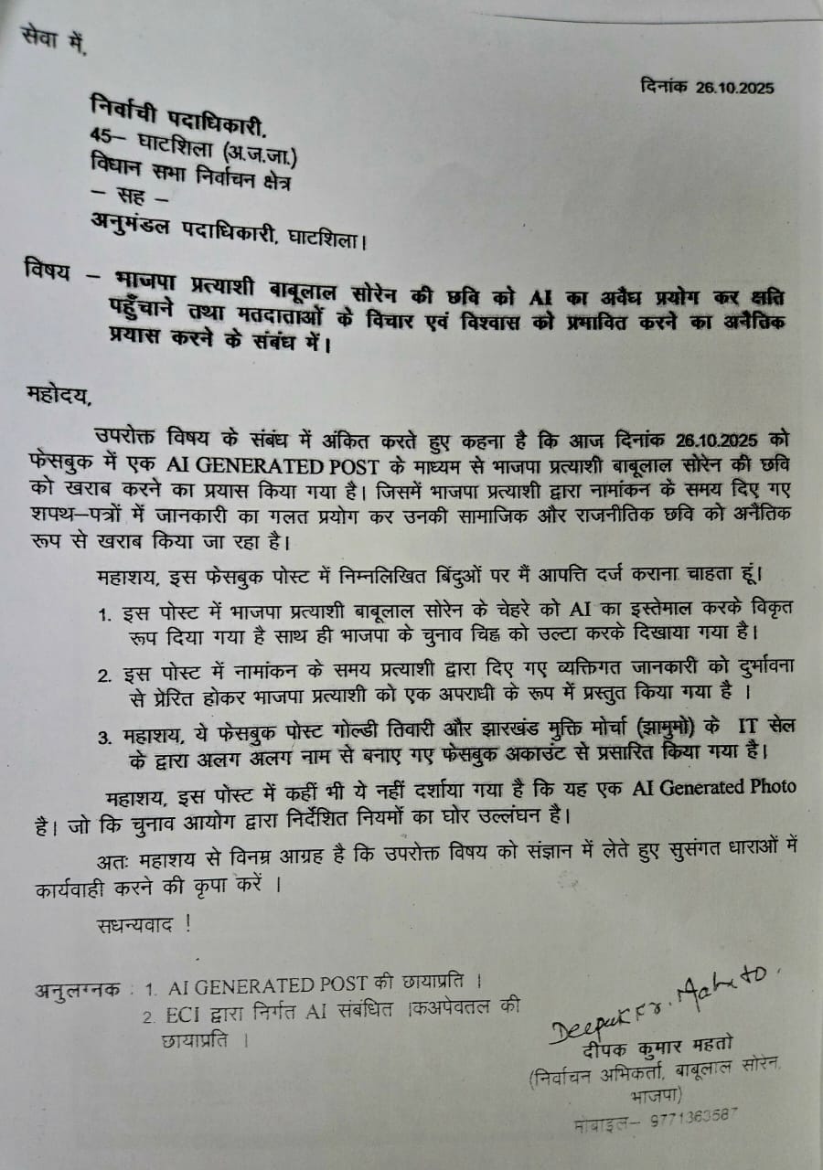 घाटशिला उपचुनाव में आर्टिफिशियल इंटेलिजेंस (AI) के दुरुपयोग का मामला सामने आया है। इस संबंध में भाजपा की ओर से इलेक्शन एजेंट ने निर्वाची पदाधिकारी (अनुमंडल पदाधिकारी, घाटशिला) को पत्र लिखकर आपत्ति दर्ज की है और कार्रवाई की मांग की है। पत्र में कहा गया है कि भाजपा प्रत्याशी बाबूलाल सोरेन की छवि को नुकसान पहुंचाने के लिए झामुमो कार्यकर्ताओं द्वारा AI का अवैध प्रयोग किया जा रहा है। आरोप है कि इस माध्यम से मतदाताओं के विचार और विश्वास को प्रभावित करने तथा प्रत्याशी की सामाजिक और राजनीतिक छवि को अनैतिक रूप से खराब करने का प्रयास किया गया है।