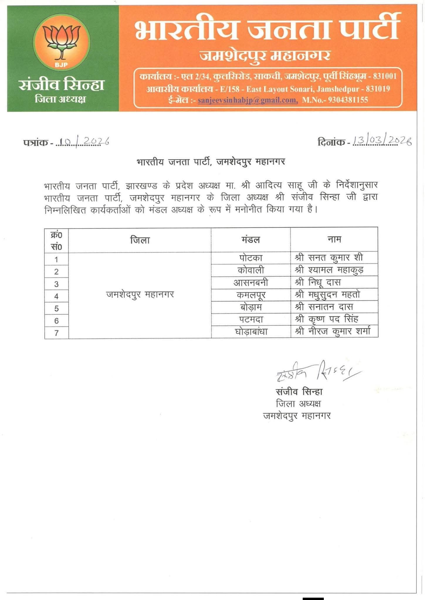 झारखंड भाजपा के प्रदेश अध्यक्ष आदित्य साहू के निर्देशानुसार भाजपा जमशेदपुर महानगर के जिलाध्यक्ष संजीव सिन्हा ने संगठनात्मक विस्तार को मजबूत करते हुए महानगर के सात मंडलों में नए मंडल अध्यक्षों की मनोनयन की घोषणा की है। शुक्रवार को प्रेस विज्ञप्ति जारी कर इसकी जानकारी दी गई। जारी सूची के अनुसार पोटका मंडल में सनत कुमार शी, कोवाली मंडल में श्यामल महाकुड़, आसनबनी मंडल में निधू दास, कमलपुर मंडल में मधुसुदन महतो, बोड़ाम मंडल में सनातन दास, पटमदा मंडल में कृष्ण पद सिंह एवं घोड़ाबांधा मंडल में नीरज कुमार शर्मा को मंडल अध्यक्ष मनोनीत किया गया है। वहीं, जमशेदपुर महानगर अध्यक्ष संजीव सिन्हा ने सभी नवनियुक्त मंडल अध्यक्षों को शुभकामना देते हुए विश्वास जताया कि उनके नेतृत्व में संगठन और अधिक सशक्त होगा और पार्टी की नीतियों एवं कार्यक्रमों को जन-जन तक पहुंचाने में महत्वपूर्ण भूमिका निभाई जायेगी।