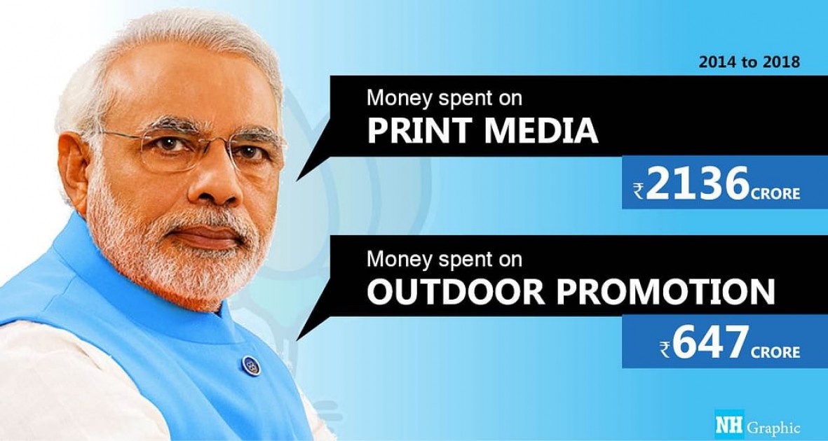 सरकार ने जवाब दिया है उसके अनुसार पहले कार्यकाल में 26 मई 2014 से 29 मई 2019 तक नरेंद्र मोदी सरकार के प्रचार का खर्च सिर्फ प्रिंट मीडिया के लिए-19,19,22,02,121 (19 अरब, 19 करोड़, 22 लाख, दो हज़ार 1 सौ 21 रुपए ) है। वहीं आउटडोर मीडिया में सरकार का प्रचार खर्च- 8,260,522,201 (8 अरब, 26 करोड़, 5 लाख, 22 हज़ार 2 सौ एक रुपए) है। पहले कार्यकाल की तारीख 26 मई 2014 से 29 मई 2019 एवं दूसरे कार्यकाल 30 मई 2019 से 09 अक्टूबर 2019 तक इलेक्ट्रॉनिक मीडिया में मोदी सरकार का प्रचार खर्च - 27,215,749,227 (27 अरब, 21 करोड़, 57 लाख, नौ हजार 2 सौ 27 रुपए) है। दूसरे कार्यकाल में 30 मई 2019 से 09 अक्टूबर 2019 तक प्रिंट मीडिया में प्रचार का खर्च - 47,40,38,941 (47 करोड़, 40 लाख, 38 हज़ार,941 रुपये) बताया गया है। इस प्रकार से देखें तो कुल मिलाकर सरकार के पहले कार्यकाल 26 मई 2014 से 29 मई 2019 एवं दूसरे कार्यकाल की शुरुआत 30 मई 2019 से 09 अक्टूबर 2019 तक सरकार के प्रचार का कुल खर्च -55,142,512,490 (55 अरब, 14 करोड़, 25 लाख, 12 हज़ार 490 रुपए) है।