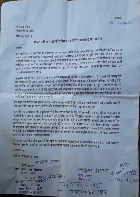 पत्थलगड़ी को केंद्र रहा खूंटी जिले से पारंपरिक ग्राम प्रधानों ने मुख्यमंत्री को पत्र लिखकर उन्हें उनकी घोषणा याद दिलाई है। उन्होंने पत्र में लिखा है कि पिछली सरकार में उनलोगों पर फर्जी आरोप दर्ज किया गया था और क्षेत्र में मानवाधिकार का उलंघन किया गया था। यह भी लिखा है कि मुख्यमंत्री हेमंत द्वारा राजद्रोह के मुकदमों को वापस लेने की घोषणा सराहनीय है, लेकिन फिर भी अभी तक सभी के उपर से मुकदमा वापस नहीं लिया जा सका है। ग्राम प्रधानों ने मुख्यमंत्री से मांग की है कि पत्थलगड़ी के सभी मामलों को जल्द ले जल्द वापस लिया जाए साथ ही पांचवी अनुसूची के प्रावधानों और पेसा कानून को पूर्ण रूप से लागू किया जाए।